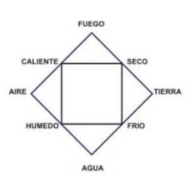 En occidente, el filósofo, médico, herbista, mago, matemático Empédocles (en Sicilia, siglo V a. C.), retomando algunas ideas de los pitagóricos y de otros filósofos de la naturaleza contemporáneos, graficó un Cuadrado elemental en el que concibe a los 4 elementos como manifestaciones físicas y esencias espirituales (divinas) que provendrían de cambios en la temperatura y en la humedad de una primera sustancia indiferenciada.